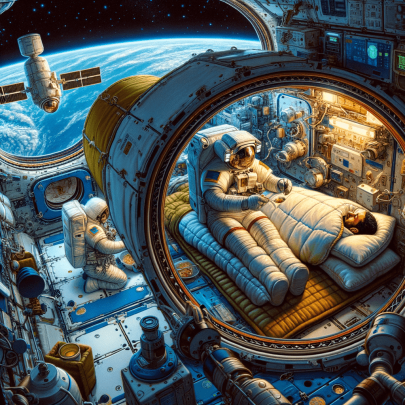 Now, when it comes to sleeping… well, space really throws a curveball. There are no beds as we know them here, because, surprise surprise, gravity isn’t a thing up there to keep us snuggled in place. Instead, astronauts doze off in snug, closet-sized spots, either clinging to walls or ceilings—or whatever you’d call them in space!